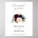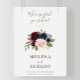 Felicite o seu clássico evento de casamento com isso. Estamos tão felizes que esteja aqui poster de boas-vindas ao casamento. O design apresenta lindas flores rosa, pincéis, azuis, marinhos e burgundy pintadas manualmente com folhas verdes, bem agrupadas em buquês elegantes para embelezar seus cartões de convite para eventos.