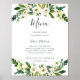 O carinhoso cartaz do menu de casamento mostra suas seleções de janto em caligrafia manuscrita e cartazes modernas de blocos. Adornada com vegetação botânica aquática e flores brancas que combinam com a nossa coleção de casamento Alabastro Floral.