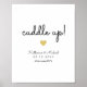 Uma elegante placa de "Cuddle Up" em preto e branco para cobertores ou xales para seus convidados de casamento. A design também apresenta um pequeno coração de folha de ouro falso. Personalize substituindo o texto de amostra.