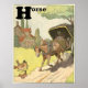 A letra H do alfabeto é para "Cavalo" puxando uma carruagem com um entregador viajando por uma estrada de terra ao passar por uma tradicional casa de madeira e tijolo aparente no campo. Desenho do artista francês Benjamin Rabier. © KidsLife
