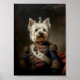 Um retrato oficial de pintura a óleo de um terrier da West Highland vestido com um uniforme militarista de renascimento do século XVIII como Napoleão