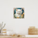 Poster com um gatinho no estilo Art Nouveau de Alphonse Mucha! Um gatinho branco e fofo com poses azuis com flores amarelas. Um presente bonito para amantes de gatos e colecionadores de Art Nouveau!