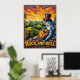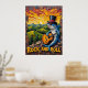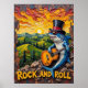 Esta pintura imaginativa retrata um tubarão, adornada com um chapéu de topo e óculos de sol legal, desencadeando uma "sinfonia do pôr do sol" em uma guitarra elétrica de um cume rochoso. A cena desdobra-se sobre a rolagem de colinas verdes e árvores, banhadas na luz quente e texturizada de um sol que se põe. O vibrante, incapaz de escovar cria uma atmosfera poderosa e caprichosa, celebrando o espírito "ROCK and ROLL" em um ambiente natural único.