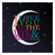 Frase colorida, "Ame-te à lua e às costas" com as estrelas noturnas e o céu atrás de uma lua parcial. Projetado por Simplesmente Posto pela Robin; certos elementos através da associação com a Fábrica de Gráficos