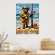Esta charmosa trabalho de arte apresenta um urso vestido de bombeiro, cheio de capacete e óculos de sol, tocando um violão acústico enquanto se inclinava contra um posto de madeira numa praia arenosa. Um pote de mel fica perto. O fundo mostra um oceano vibrante com ondas suaves e um céu azul com nuvens fluffy. A pintura usa pinceladas grossas, texturizadas, dando uma sensação caprichosa e entusiasmante, com "Love My Honey" escrito abaixo.