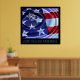 Uma imagem abstrato patriótica com uma queda d'água sobre um fundo de bandeira com círculos concêntricos radiando para fora. Que América Deus abençoe.
