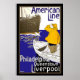 poster de viagens vintage da American Line com um transatlântico ligado a Filadélfia, Queenstown e Liverpool. Marinheiro em um pequeno barco que olha enquanto a linha passa.