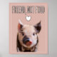 Este poster de vegan apresenta um leitão branco e preto giro sobre um fundo rosa. O texto branco diz "amigo, não comida"