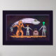 Uma menina de terraço vermelha fica de braços cruzados com os amigos da alienígena enquanto um disco voador sobe acima de todos eles nesta ilustração científica original de Richard H. Fay.