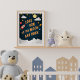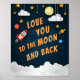 Pôster temático do espaço sideral para o quarto do seu pequeno astronauta apresenta a citação "amo você até a lua e de volta" em um fundo de planetas, estrelas, nuvens e um foguete.