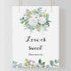 Este sinal de amor de eucalipto tropical é doce é perfeito para um chá de noiva de casamento no destino. O design apresenta rosas deslumbrantes ilustradas em roxo, branco, azul e rosa aninhadas em um lindo buquê de folhas verdes de eucalipto.