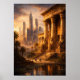 Step into a mesmerizing alternate reality with this fantasy wall art, where a colossal, columned Ancient Egyptian temple stands in harmony with a sprawling modern skyscraper skyline. Perfect for art lovers of all ages, this painting captures a retro-futuristic vision under a golden sunset, featuring pharaoh statues, palm trees, and a calm water lily pond. This unique blend of historical grandeur and architectural marvel will transform any modern living room, office, or study into a world of imagination and beauty. Available in multiple print sizes for a bespoke look.