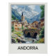 Affiche artistique représentant un charmant village d'Andorre, niché au pied des montagnes enneigées. Un pont de pierre fleuri traverse une rivière cristalline, entouré de maisons en pierre et de paysages alpins spectaculaires. Une décoration parfaite pour les amoureux de la nature et des voyages.