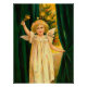 Vintage illustration of a lovely angel with white feather wings and golden hair, ringing the bell for Christmas time. On the background behind the dark green curtains is a nostalgic Christmas tree with bright burning candles.