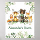 Animais da Floresta em Aquarela para Quarto. Animais bebês incluem Urso com Laço Verde, Veado, Alce, Guaxinim, Coelho, Raposa e Coruja em folhas de eucalipto e vegetação da floresta. Adicione Nome.