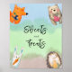 Convites para chuveiros de bebês neutros em termos de gênero. Um exemplo de uma madeira de cor aquática: raposa com mirtilo em patas, urso com framboesa, ouriço com pera, coelho com cenoura. O fundo de aquarela é multicolor.