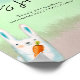 Convites para chuveiros de bebês neutros em termos de gênero. Um exemplo de uma madeira de cor aquática: raposa com mirtilo em patas, urso com framboesa, ouriço com pera, coelho com cenoura. O fundo de aquarela é multicolor.