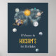 Celebre o marco especial do seu filho com este poster de aniversário de temas temáticos do espaço sideral mágico. Apresentando planetas imaginários, luas e estrelas em marinho e mira dourada. Estas Posters de boas-vindas do Aniversário do Espaço Exterior Galáxia Sun Moon Stars and Planets são perfeitas para uma simples festa de aniversário. O moderno design whimsical mostra um fundo de marinho-azul-aquarela adornado com um sol vibrante amarelo, lua de cinza sorridente, planetas de cor pastel e estrelas de brilho dourado dispersas.