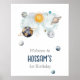 Celebre o marco especial do seu filho com este poster de aniversário de temas temáticos do espaço sideral mágico. Apresentando planetas imaginários, luas e estrelas em marinho e mira dourada. Estas Posters de boas-vindas do Aniversário do Espaço Exterior Galáxia Sun Moon Stars and Planets são perfeitas para uma simples festa de aniversário. O moderno design whimsical mostra um fundo de marinho-azul-aquarela adornado com um sol vibrante amarelo, lua de cinza sorridente, planetas de cor pastel e estrelas de brilho dourado dispersas.