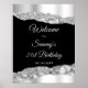 Este elegante e glamouroso sinal de boas-vindas festas de aniversário apresenta lágrimas de brilho falso prateado num fundo preto. O texto combina o script manuscrito e as fontes sans serif modernas para um aspecto elegante e sofisticado.