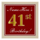 Este design simples e bolsa mensageifesta de aniversario elegante apresenta uma mensagem personalizada como "Name-Here's 41rua Birthday!" (com a "41ruas" com um olhar falsa/imitado de cor dourada) dentro de uma área quadrada de cor vermelha com um contorno de fronteira simples. O nome está em um texto elegante, de cor branca, semelhante a script, e pode ser personalizado. Uma poster personalizada como esta poderia talvez ser usada como decoração em uma festa para alguém que comemora seu quarenta primeiro aniversário. [~Z0000234]