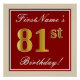 Este design simples e bolsa mensageifesta de aniversario elegante apresenta uma mensagem personalizada, como "81ruas Birthday!" (com a "81ruas" com um aspecto de cor dourada falsa/imitação), dentro de uma área quadrada vermelha com um contorno simples de fronteira. O nome está em um texto elegante, de cor branca, parecido com script, e pode ser personalizado. Uma poster personalizada como esta poderia talvez ser usada como decoração em uma festa para alguém que comemora seu oitenta aniversário. [~Z0000234]