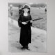 Esta foto da história americana mostra Annie Oakley de pé em um chapéu preto e vestido enquanto segurava um rifle que Buffalo Bill lhe deu, 1922.