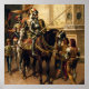 Cavalos medievais de armadura brilhando são montados em cavalos, segurando lances e vestindo capacetes. O cenário parece ser um grande salão ou pátio adornado com detalhes e faixas intrincadas. Esta pintura é "To the Joust" de Cesare Detti.