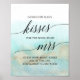 Este pôster de adivinhação de beijos na praia em aqua e dourado é uma atividade divertida para um chá de noiva tropical. Encha um pote com Beijos da Hersey e peça aos seus convidados para adivinhar quantos doces estão no pote. A resposta mais próxima ganha um prêmio! O design simples e moderno apresenta uma incrível pintura em aquarela turquesa, azul e azul claro com um brilho suave dourado que lembra a areia e o mar. Está associado a uma caligrafia elegante e linda.