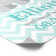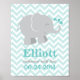 Na moda e doce personagem "Bem-vindo com amor", a impressão de arte infantil apresenta um adorável bezerro de elefante de recém-nascidos cinzas com salpicos azuis aqua brilhantes, um padrão moderno de fundo de listras de gástron branco e azul aqua, texto personalizado para o primeiro nome do bebê e data de nascimento.