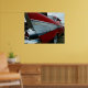 Uma foto baixa e próxima do lado de um clássico ar de Chevy Bel Air vermelho e branco da retaguarda, capturando aquela barbatana incrível!