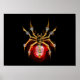 Aranha mecânica, com pá-pá de ouro, engrenagens de latão e uma lâmpada de vidro vermelha sobre fundo preto. Estilo Steampunk.