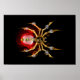 Aranha mecânica, com pá-pá de ouro, engrenagens de latão e uma lâmpada de vidro vermelha sobre fundo preto. Estilo Steampunk.