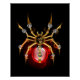 Aranha mecânica, com pá-pá de ouro, engrenagens de latão e uma lâmpada de vidro vermelha sobre fundo preto. Estilo Steampunk.