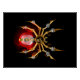 Aranha mecânica, com pá-pá de ouro, engrenagens de latão e uma lâmpada de vidro vermelha sobre fundo preto. Estilo Steampunk.