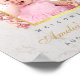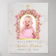 Há uma foto de uma menina em um arco de folha de ouro falso, com orquídeas rosa ao redor do arco. Acima dela, há uma cruz, também de folha de ouro falso. Abaixo dela, o nome e a ocasião são escritos em uma caligrafia dourada, a mensagem de boas-vindas e a data em letras maiúsculas pequenas pretas. O fundo é de mármore branco.