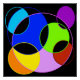 Design colorida e geométrica, intersetando círculos com cores arco-íris sobre fundo preto