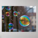 Essa imagem encantadora captura um momento de pura magia, com uma coleção de bolhas iridescentes ou de órbitas de vidro suspensas no ar-médio. Cada esfera reflete o mundo à sua volta em uma lente distorcida e colorida, criando uma bela mistura de arco-íris e luz suave. A maior bolha capta lindamente o reflexo de uma árvore e luzes distantes, acrescentando ao cenário um toque de sonho de qualidade surreal. A imagem evoca uma sensação de maravilha, capricho e beleza delicada, perfeita para aqueles que apreciam arte, magia, e a simples alegria das bolhas.