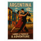 Poster de viagens vintage da Argentina. Foreground: um casal de tango apaixonado dançando em pose dramática, o homem de terno preto e a mulher de um vestido vermelho que flui.