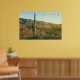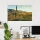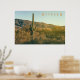 Uma paisagem do Deserto de Sonoran apresenta um cacto saguaro alto no primeiro plano, cercado por vegetação do deserto. O cacto coloca-se de forma proeminente num pano de fundo de colinas rolantes e num céu limpo. O tom geral é caloroso e nostálgico, evocando uma sensação do árido sudoeste americano. A luz lançando sombras suaves através da cena.