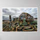 Fotografia de armadilhas ou potes de lagosta, com cordas coloridas amontoadas ao seu lado numa praia contra o céu nublado.