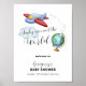 Modern Watercolor "Baby Around The World", adventure awaits, travel baby shower theme, design feture blue and red airplane fly over the sky decor with cloud and world globe map, this is gender neutral baby shower design, perfect for both baby boy and baby girl baby shower. you can customize your own unique text and color.
