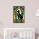 This playful art deco black cat climbs a stylized teal curtain framed by golden motion trails and geometric folds. The dynamic upward composition and rich 1920s color palette create an energetic yet elegant piece perfect for kitchens, hallways and creative spaces where cat lovers appreciate sophisticated design.