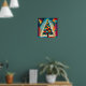 This art deco geometric design of a Christmas tree made of multiple colorful triangle.