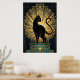 A refined black cat profile silhouette framed by a single golden halo circle and subtle teal rays. This minimalist art deco masterpiece with clean negative space embodies 1920s elegance for sophisticated modern interiors and cat enthusiasts.