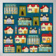 Arte gráfica colorida para sala de brincadeiras de crianças. Fundo azul marinho fofo. Casas e cidade.