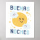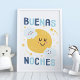 Boa noite! Pendure esta arte de berçário feliz no quarto do seu novo bebê ou filho. A lua noturna, as nuvens e as estrelas brilharão intensamente em qualquer lar bilíngue e de língua espanhola.