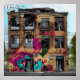 Edifício urbano abandonado com arte de grafite rosa e azul caindo e se desmoronando. Postar apocalíptico.