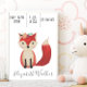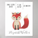 Arte personalizada para viveiros com raposa aquosa no meio e nome, peso, data de nascimento e comprimento escritos em caracteres decorativos elegantes. Excelente decor para o quarto do seu bebê
