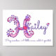 Letra H bonita arte de monograma de nome em pôster perfeito para o quarto ou sala de brincar de uma menina em tons de rosa e roxo. Personalize com o seu próprio nome começando com H e o significado do nome para um toque verdadeiramente personalizado no quarto ou berçário da sua filha. Este pôster lê nome Hailey prado de feno. Uma pequena onda, selvagem e espirituosa. Impressão de pôster fofo ideal para um presente de novo bebê, batizado ou chá de bebê. © Monograma exclusivo da letra H com corações e flores desenho e arte gráfica por Sarah Trett. www.sarahtrett.com para www.mylittleeden.com